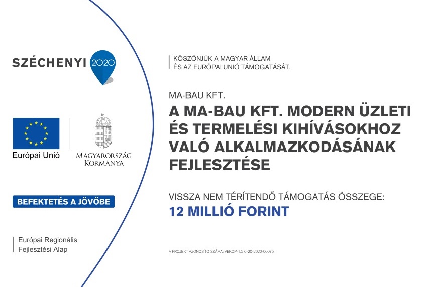 A gép beszerzése megtörtént. A számlák kifizetésén és a gép üzembe helyezésén szintén túl vagyunk. A projekt fizikai készültsége: 100%. A projekt pénzügyi készültsége: 100%. A kibővült eszközállomány segítségével vállalkozásunk több megrendelést tud teljesíteni, kapacitásunk növekszik. A több megrendelés növeli a MA-BAU Kft. munkahely megtartó képességét a magasabb árbevétel elérése által.